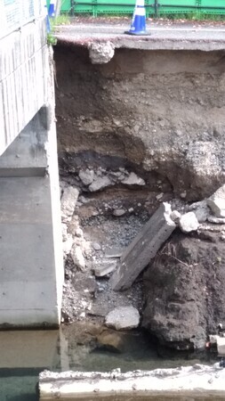 健軍川と江津湖の合流点の崩落。上流側は護岸を修理するために、斜道を作っている。下流側は手つかず。橋のコンクリートを避けるように侵食しているなあ。