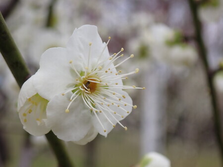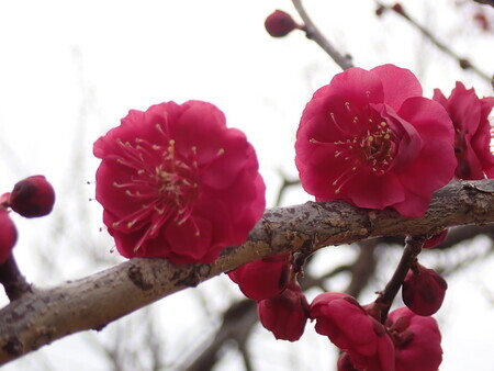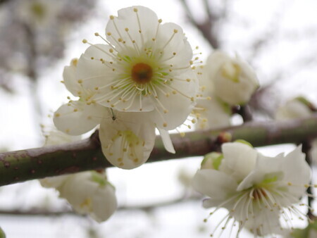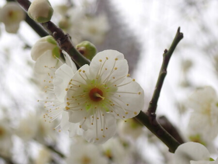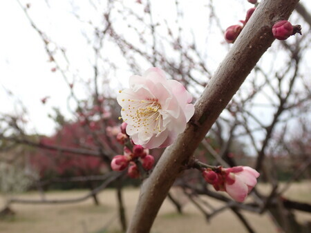 梅。護国神社前の梅林はけっこう咲いている。やっぱり曇り空ではなあ…