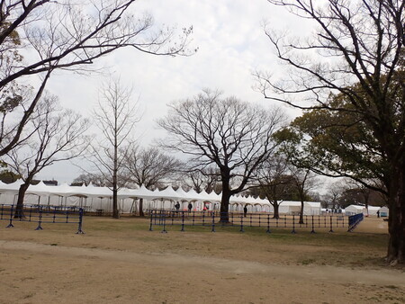 二の丸公園は、熊本城マラソンのためのテントでいっぱい。