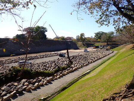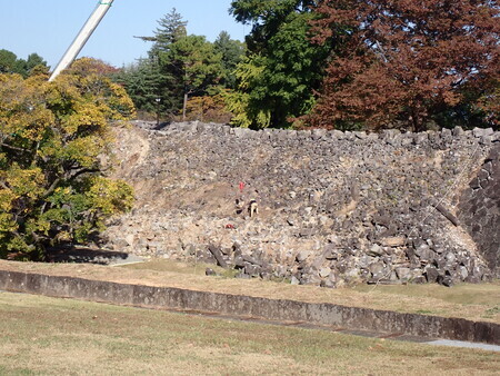 西出丸西側石垣崩落箇所の石材を回収中。石垣の石って、一つあたりが相当に重そうだよなあ。石材の中に長い部材が混じっていたけど、あれは石垣の上に再現されていた壁の支え石か。本当に滑り落ちるように崩れたのだなあ。