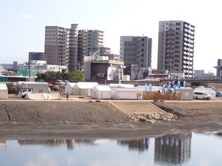 白川河川敷では、植木祭の準備が行われていた。テントに温室に。