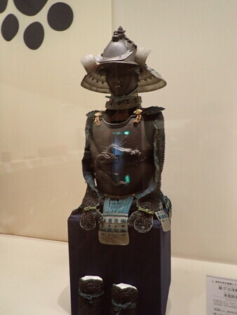 「龍打出浅葱糸威し南蛮胴具足」。武具類はあらかた通期展示。前回も写真を紹介しているけど、今回は手足に注目。籠手や臑当てが鎖帷子になっているのは、越中様と違うなあ、と。