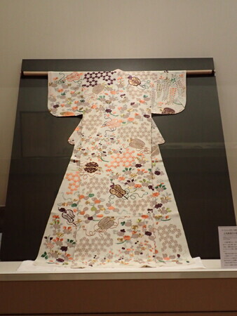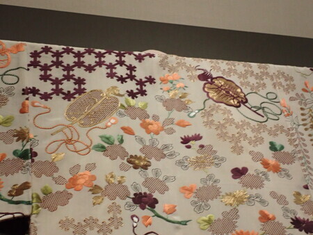 「白地唐扇花卉模様小袖」。前期から展示替え。14代細川護久夫人の宏子所用のもの。これは永青文庫ではなく、県立美術館収蔵品だから撮影可能、と。染と刺繍の量がすごい。
