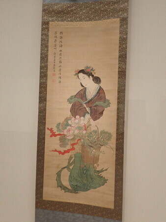 「細川家の武具と大名道具」では調度品と小袖が入れ替わり。「細川家ゆかりの近世絵画」では二点が入替え。第二室では仏教美術が2点、刀剣が2点、近代日本画が全部入替え。半分とは行かないけど、かなり展示替えされている。