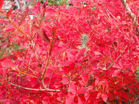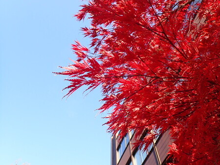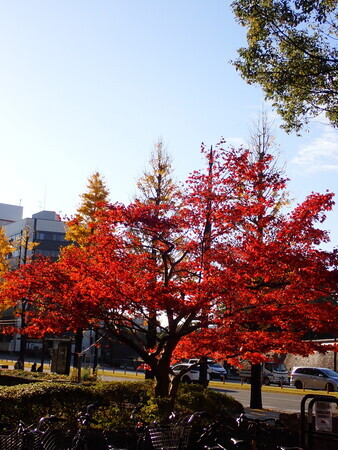 これも、市役所敷地内で紅葉している木。葉っぱが珍しい形をしているな。なんて言う木なんだろう。