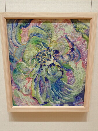 今回の展示作品の中では、これが一番印象に残った。基本、抽象画ってあんまりピンとこないんだけど、これはいい感じに爆発している感じ。上の方は銀箔は貼ってあったり、クリアブルーが使われていたり、ツヤ感があって、下はマットな感じ。右下の意匠がワンポイント。