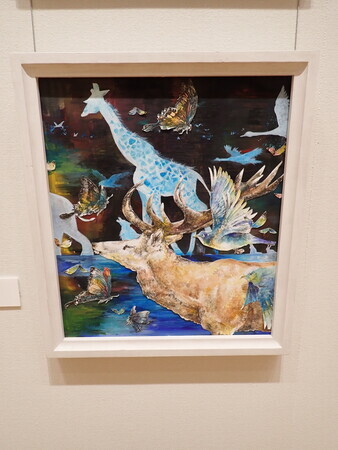 水彩の背景の手前に、ペン画の動物を張り付けている、言わば切り絵。タッチの違いがおもしろい。