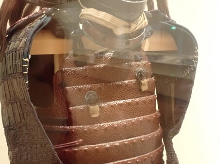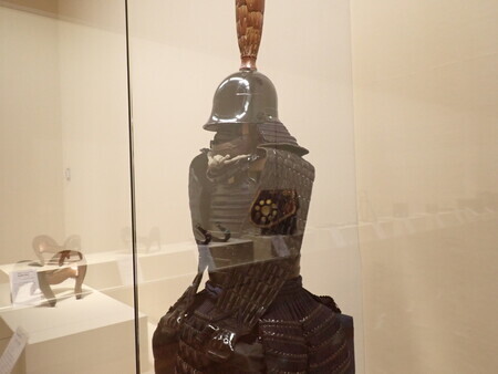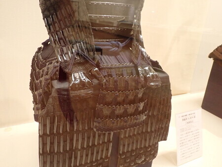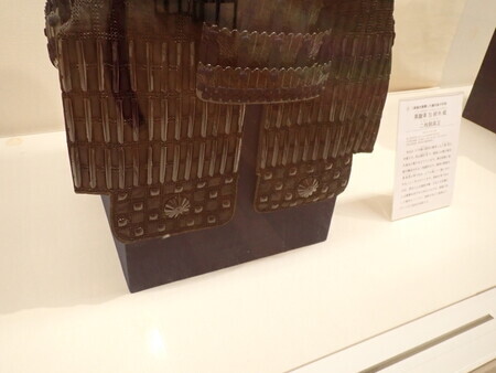 「栗色革包紺糸射向威二枚胴具足」。細川斉護佩用ということは、幕末に近い時期か。肉眼で見るとけっこう黒く見えるけど、写真では赤みが強い。これが栗色か。胸の金具が九曜紋。