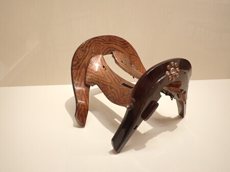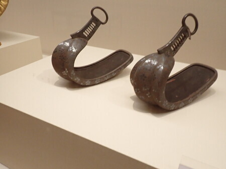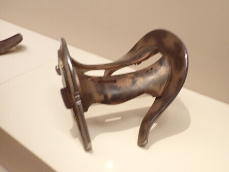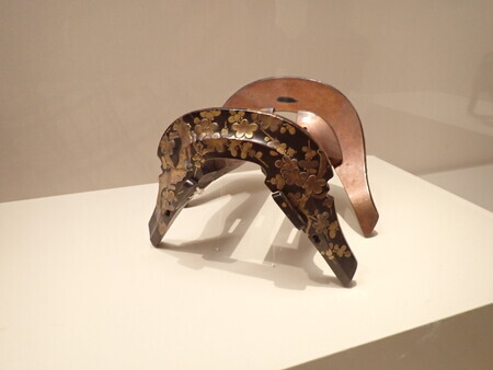 「梅樹文蒔絵鞍」。これは、桃山時代の鞍。前輪の梅の花の高蒔絵がきれい。太ももや尻が当たる部分の塗りが摩耗しているから、それなりに使った鞍のようだ。