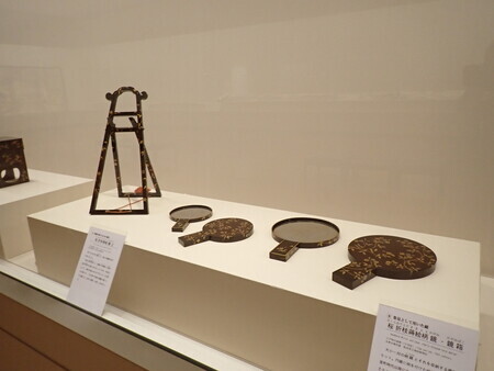 「桜折枝蒔絵柄鏡・鏡箱・鏡立」。柄付の丸い鏡を台に立てかけて使うのか。蒔絵がいいなあ。後の鬢台、お歯黒道具も同じモチーフだからセットなのかね。
