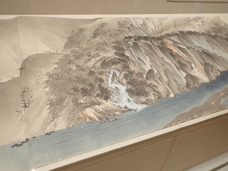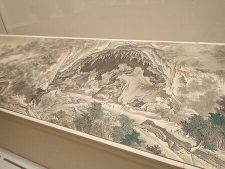 第一室は、例によって永青文庫関係の文物を展示。今回は鎧2領に鞍が3点などで馬具が多め。調度品は鏡や鬢台などの化粧道具、挟み箱に行器。絵画は伝雪舟の大きな屏風絵に狩野常信の「七十二候図」、狩野探信・探雪「手鏡」などの画帖に、領内名勝図巻の球磨川筋が展示。領内名勝図巻以外は撮影禁止。
