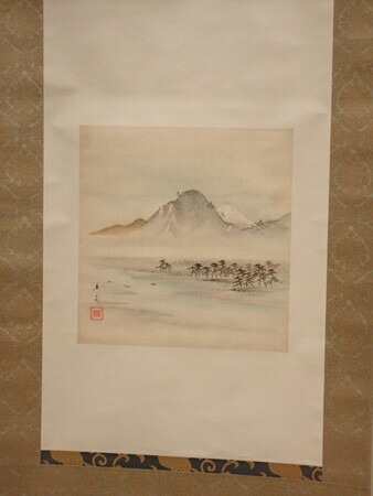 紫光斎北一「雨乞小町図」。小野小町が和歌を詠んで祈ったところ、たちまち雨が降ったという故事にちなんだ絵。描表装という手法で表装部に龍の絵が描かれているのが印象的。