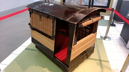 駕籠。皆乗寺に伝えられている、西南戦争の際に細川護久の三人の娘が戦火を避けるために使われた乗り物だそうだ。上益城郡内の郷士層の家を転々としたのだとか。
