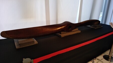 一〇式艦上戦闘機プロペラ。津森出身の退役軍人が、戦意高揚を目指して機体まるごと奉納したが、戦時中の金属供出でプロペラだけが残されている。